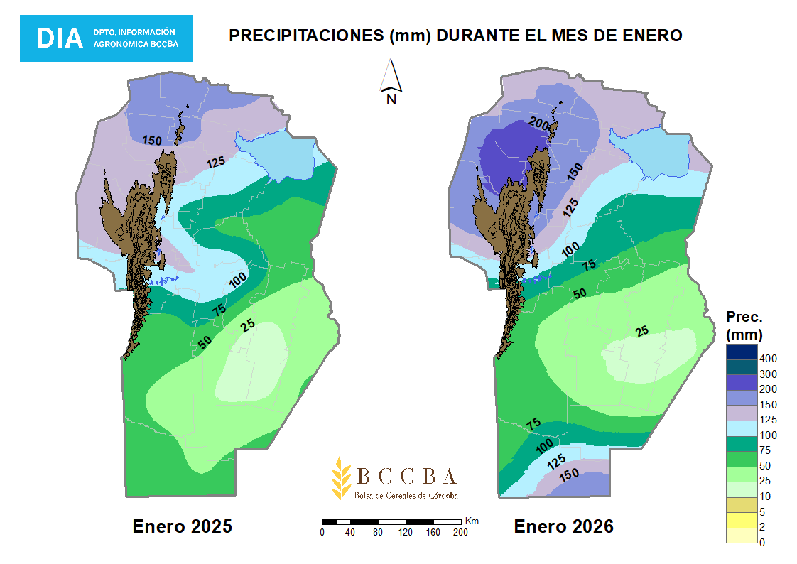 En enero las lluvias se distribuyeron de forma heterogénea con los mayores acumulados ubicados en el norte y en el sur provincial. Se destacó el registro de Jesús María, con 309 mm con los mayores milímetros registrados el 8 y el 16 del mes. En cuanto al promedio departamental, en la zona de influencia de la BCCBA, la mayoría de los departamentos presentó variaciones negativas con respecto al promedio histórico.