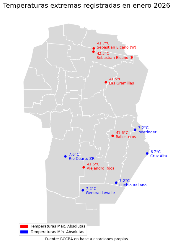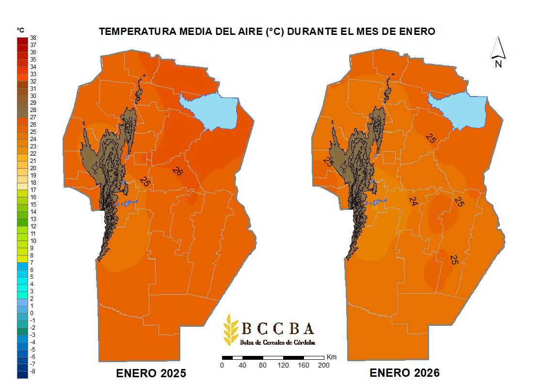 A partir de los datos proporcionados por la Red de Estaciones Meteorológicas de la Bolsa de Cereales de Córdoba, presentamos el informe agrometeorológico que refleja el análisis de las variables temperaturas del aire y precipitaciones para la provincia de Córdoba en el mes de ENERO del año 2026.