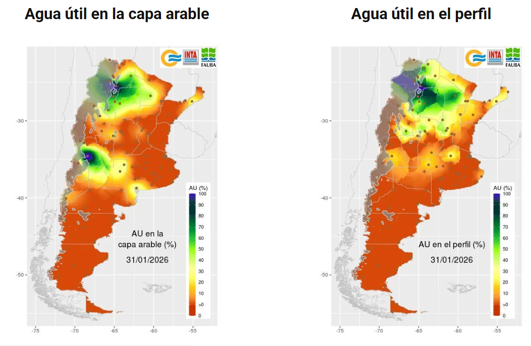 Esta situación de lluvias inferiores a lo normal se ve reflejado en el contenido de agua útil en el suelo. Según los mapas publicados por el SMN casi toda la provincia se encuentra bajo valores inferiores al 10% de agua en la capa arable. En el perfil más profundo, la situación mejora parcialmente en el norte de Córdoba, donde se observan reservas entre 30 y 40%, mientras que el resto del territorio mantiene niveles bajos a muy bajos.