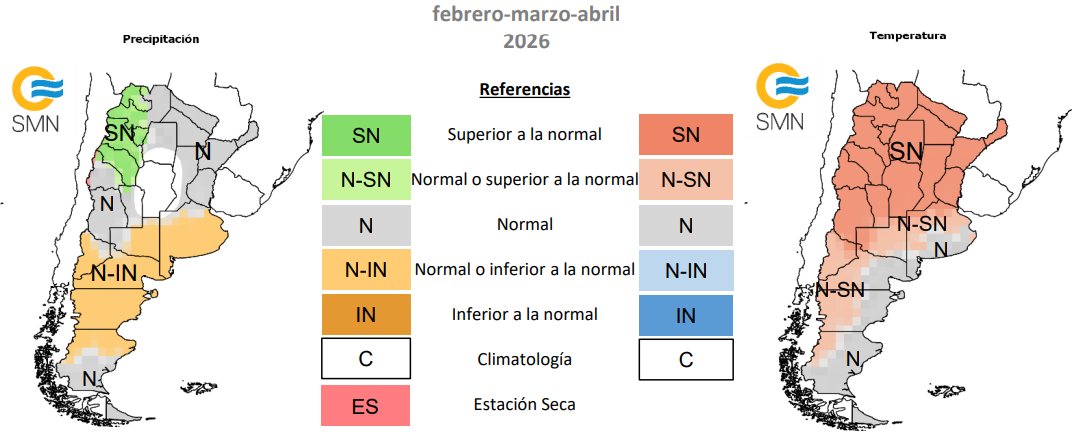 El 30 de enero el Servicio Meteorológico Nacional (SMN) publicó el Pronóstico Climático Trimestral el cual indica climatología, es decir, que no hay una categoría con mayor probabilidad de ocurrencia para las lluvias. Mientras que para las temperaturas la probabilidad de que sean superiores a la normal es de un 45-50%.