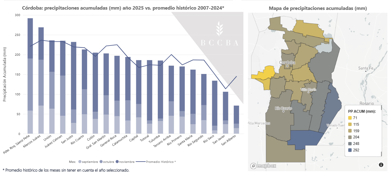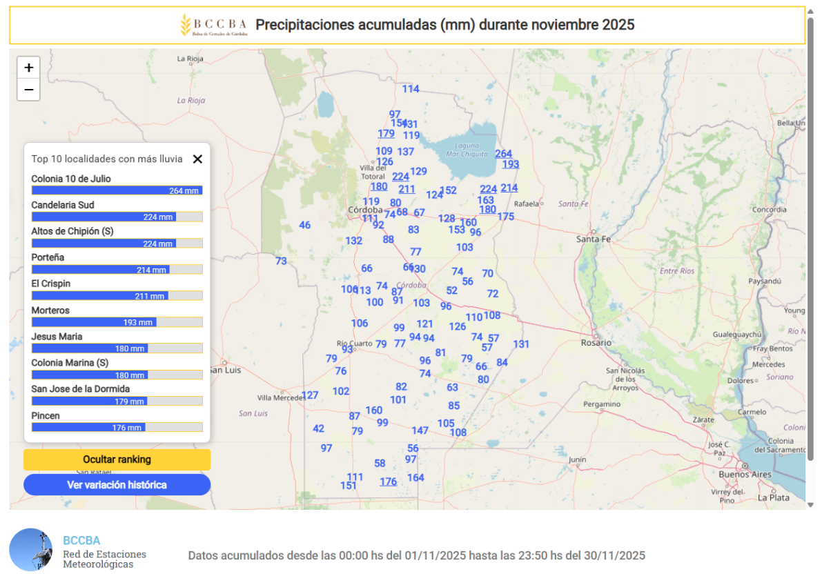 A partir de los datos proporcionados por la Red de Estaciones Meteorológicas de la Bolsa de Cereales de Córdoba, presentamos el informe agrometeorológico que refleja el análisis de las variables temperaturas del aire y precipitaciones para la provincia de Córdoba en el mes de NOVIEMBRE del año 2025.