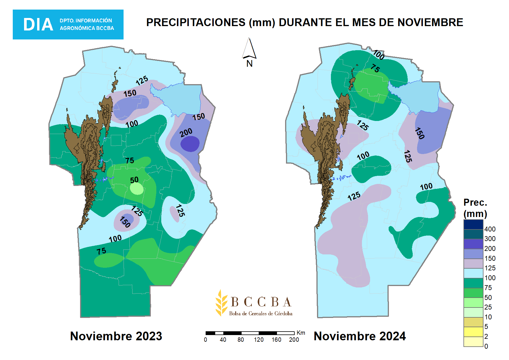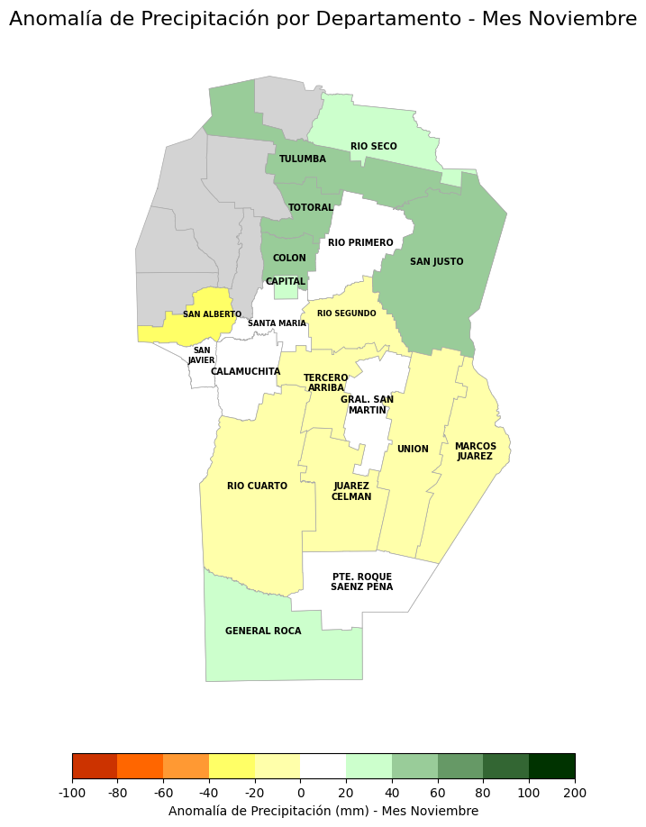 Las lluvias en noviembre de este año se presentaron de forma heterogénea, con eventos dispersos durante el mes y con registros muy variables. El resultado final llevó a mayores acumulados hacia el norte provincial, sector que venía afectado por la falta de agua en meses anteriores. Las diez localidades más beneficiadas presentaron acumulados superiores a los 175 mm.