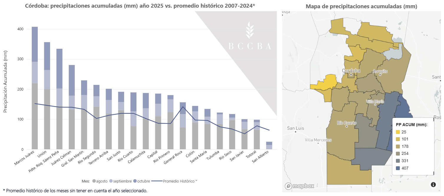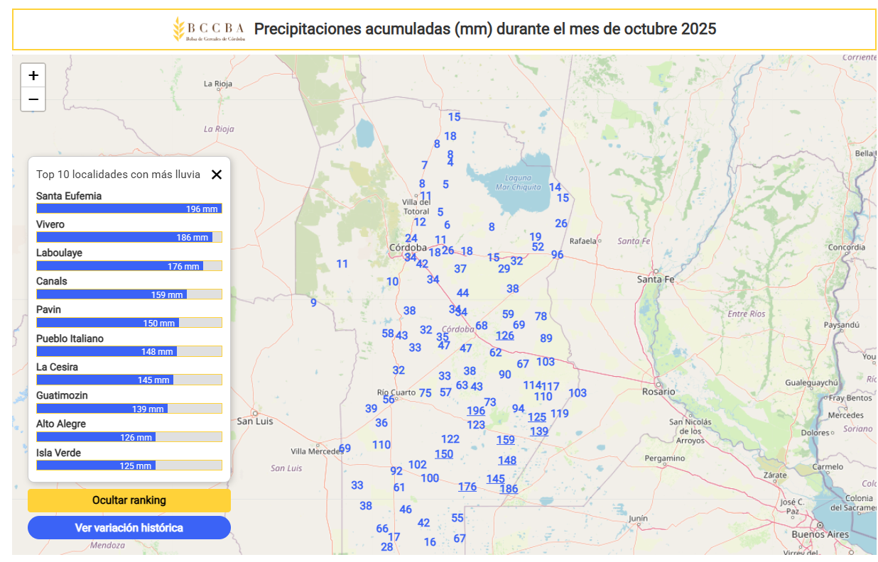 Figura 1. Mapa de precipitaciones acumuladas de octubre 2025 (https://bccba.org.ar/reporte-mensual-de-precipitaciones-octubre-2025/).