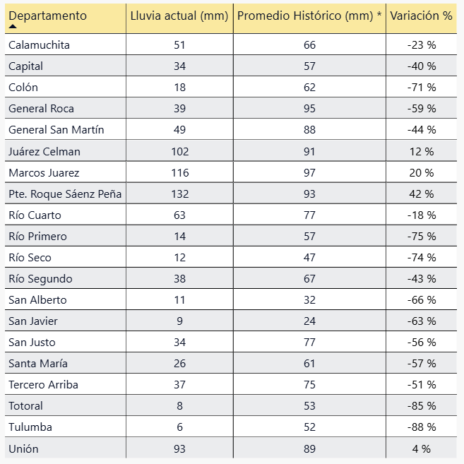 Respecto del promedio histórico mensual, predominó un déficit en buena parte de la provincia. Se destacan disminuciones en Tulumba (–88 %), Totoral (–85 %), Río Primero (–75 %), Río Seco (–74 %), San Justo (–56 %) y Santa María (–57 %). Hubo excepciones con superávit en el este y sudeste: Pdte. Roque Sáenz Peña (+42 %), Marcos Juárez (+20 %), Juárez Celman (+12 %) y Unión (+4 %).