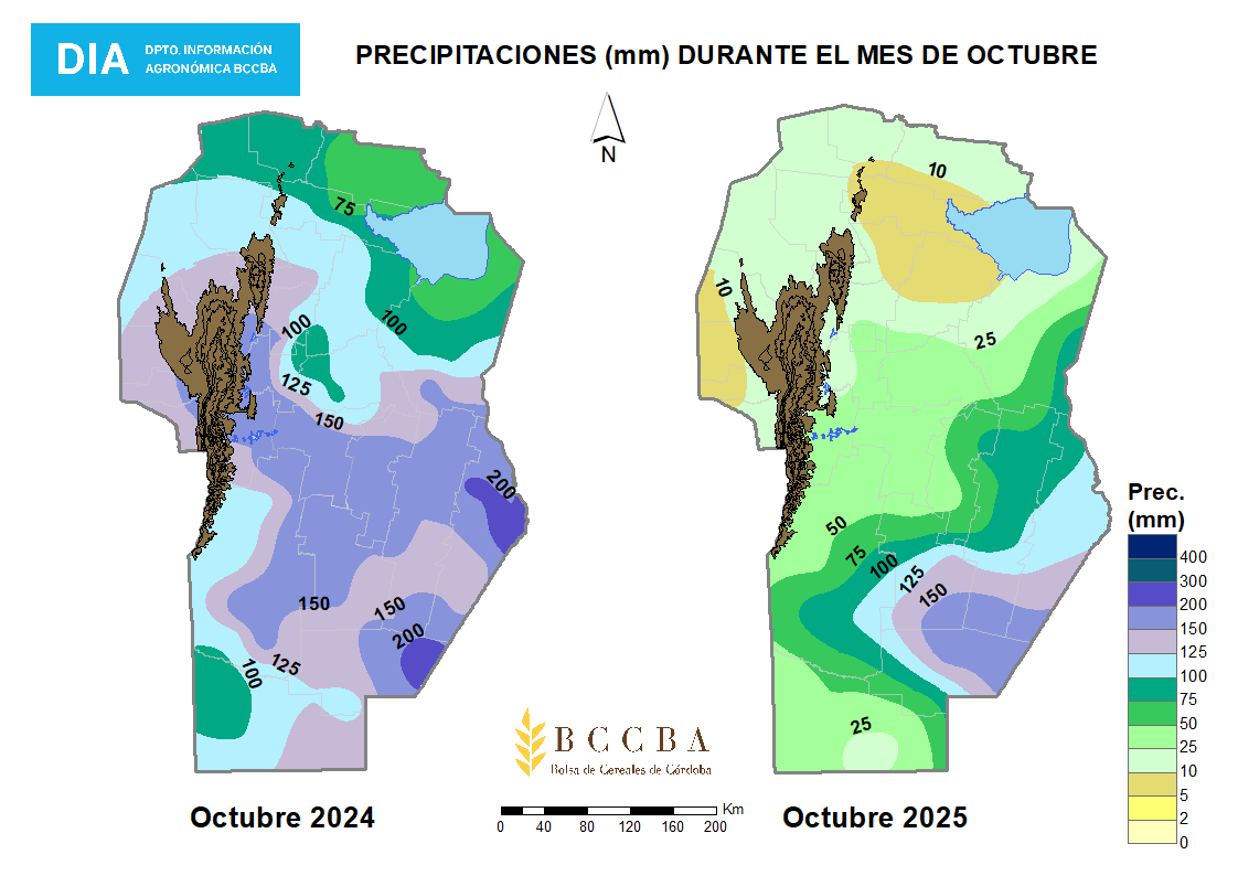 En octubre las lluvias presentaron alta variabilidad espacial, con un gradiente claro de sur/sudeste a norte. Los mayores acumulados se concentraron en el sudeste y sur provincial, donde se midieron entre 100 y 150 mm, con picos locales superiores: Santa Eufemia (196 mm), Vivero (186 mm), Laboulaye (176 mm) y Canals (159 mm). En el centro los registros fueron intermedios (30–70 mm), mientras que el norte y noreste registraron lluvias escasas (0–25 mm), con amplias áreas por debajo de 10–15 mm.