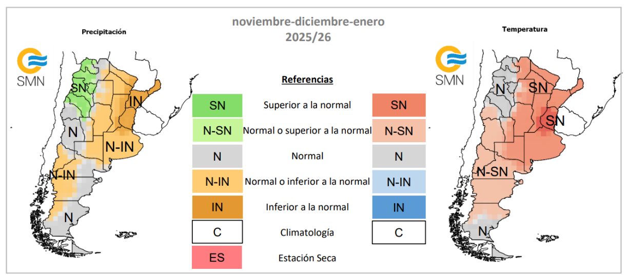 El Servicio Meteorológico Nacional (SMN) difundió, el 31 de octubre, su pronóstico climático para el trimestre noviembre–diciembre–enero 2025/26. Para la provincia de Córdoba prevé precipitaciones normales o inferiores a lo normal, mientras que las temperaturas tenderían a ubicarse por encima de lo normal durante el período.