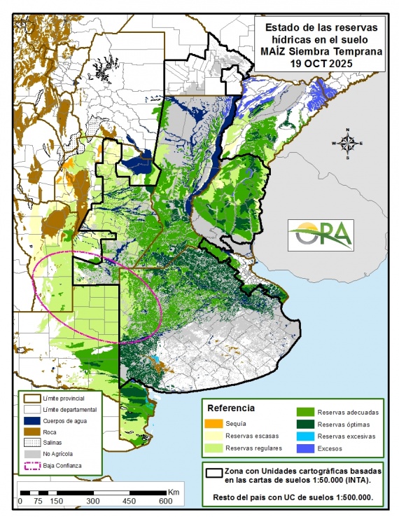 Respecto a la siembra, presenta un avance a nivel nacional del 30%, levemente por encima del promedio de las últimas cinco campañas, favorecido principalmente por las buenas precipitaciones registradas en el centro del país. Como puede observarse en el siguiente mapa elaborado por la Oficina de Riesgo Agropecuario, las reservas son óptimas para la mayor parte de la región productiva con excepción del centro-sur de la provincia de Buenos Aires que cuenta con excesos de reservas hídricas. En este sentido, aumentaría la proporción de siembra de maíces tempranos, principalmente en la provincia de Córdoba, donde el 35% del área se sembraría antes del 1° de noviembre.