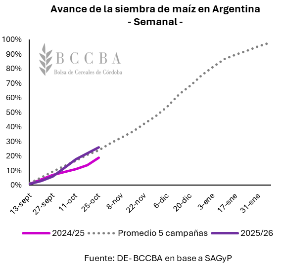 En Argentina, la Secretaría de Agricultura, Ganadería y Pesca de la Nación, mantuvo sin cambios la estimación de siembra 2025/26 en 10,25 millones de hectáreas, marcando una recuperación del 11,4% respecto a la campaña anterior. Considerando que un 80% del área se cosecha como grano con destino a uso comercial y el 20% restante se contabilice como pérdida y silaje, con un rinde promedio la producción podría superar los 57 millones de toneladas.