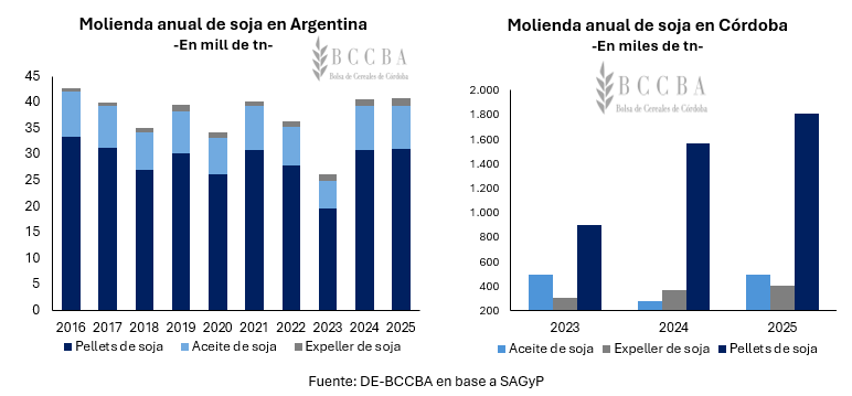 En Córdoba, la industrialización de la oleaginosa evidenció una caída del 7% interanual, ubicándose en 517 mil toneladas procesadas. En cuanto a la obtención de los subproductos, representó el 11% en la producción de aceite del total nacional, posicionándose en 224 mil toneladas y el 9% en pellets obteniendo alrededor de 185 mil toneladas. La producción de ambos se ubicó en valores menores al año previo, pero aun así se posicionó 50 mil toneladas por encima del promedio provincial.