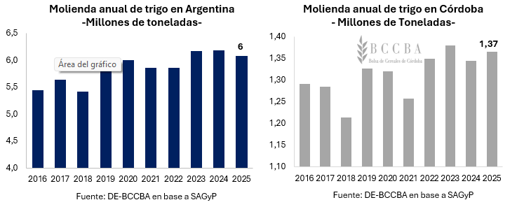 En el caso de la molienda de trigo, la industria procesó en el último año alrededor de 6 millones de toneladas, 2% por debajo de 2024. Así mismo, se ubicó en niveles elevados, unas 220 mil toneladas por encima del promedio. Mientras que, en Córdoba, la molienda del cereal fue de aproximadamente 1,37 millones de toneladas, manteniéndose en torno al volumen promedio que la provincia transforma por año.