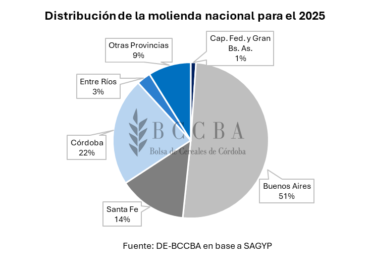 En cuanto a la distribución de la molienda del cereal en el territorio nacional para el 2025, la provincia de Buenos Aires representa el 51% del total, que industrializó alrededor de 3 millones de toneladas. Le sigue Córdoba con el 22%, Santa Fe y Entre Ríos con el 14% y 3%, respectivamente. Mientras que, el 10% restante de la molienda se encuentra distribuida entre el resto de las provincias.