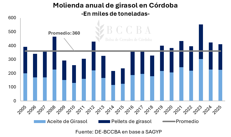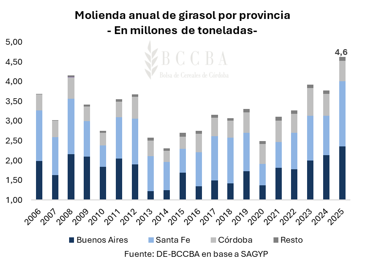 La molienda nacional de girasol para el 2025 se posicionó como récord, alcanzando las 4,6 millones de toneladas procesadas, implicado un crecimiento interanual del 22%. En donde, Buenos Aires se consolidó como la principal provincia transformadora de la oleaginosa con 2,3 millones de toneladas industrializadas para el periodo mencionado, seguida por Santa Fe con 1,6 millones de toneladas y, en tercer lugar, Córdoba con 520 mil toneladas.
