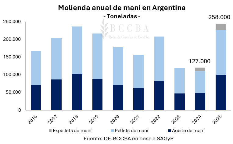 En cuanto a la molienda nacional del maní, la cual se lleva a cabo prácticamente en su totalidad en la provincia de Córdoba, se observó un repunte con respecto al 2024 del 100%, alcanzando un máximo histórico de 258 mil toneladas. En el cual, el principal destino fue el de pellets de maní que alcanzó 127 mil toneladas, seguido por el aceite de maní con 100 mil toneladas y 16 mil toneladas obtenidas de expellers.
