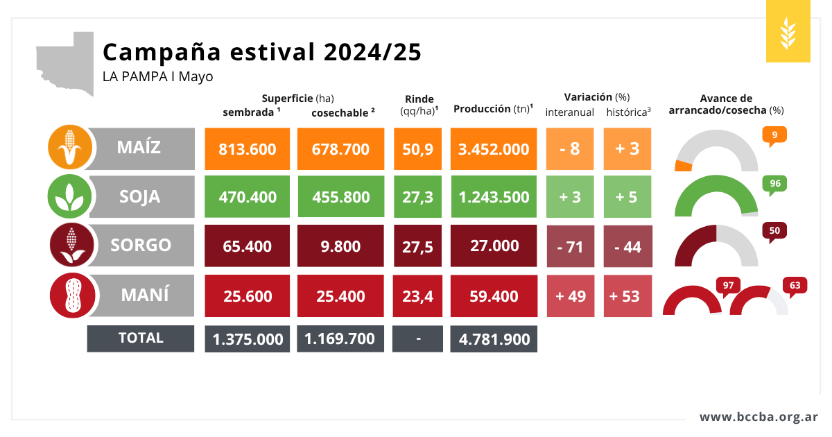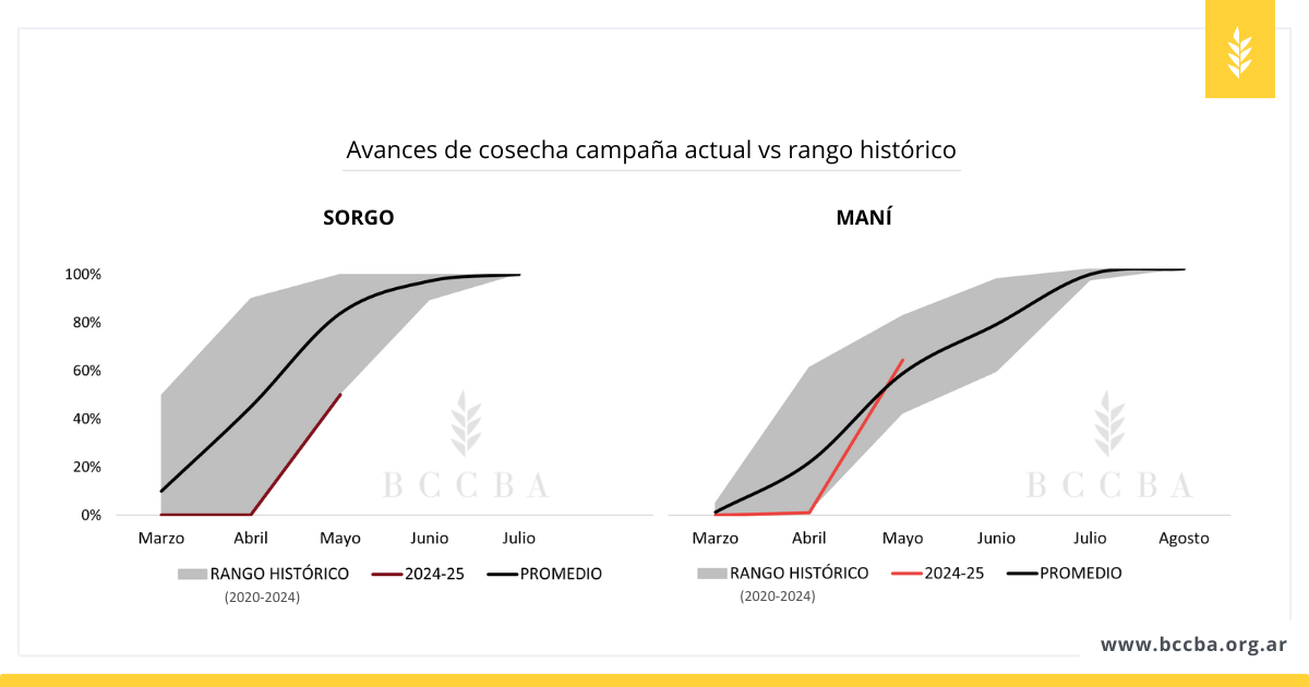 Los lotes de maní ya se encontraban arrancados, y se espera que las condiciones acompañen para avanzar con la cosecha. Sin embargo, persiste el riesgo de que las heladas recientes afecten la calidad del grano ya expuesto. En la zona de Intendente Alvear se registraron los mejores rindes, con promedios cercanos a los 31 qq/ha en grano limpio y seco. En el caso del sorgo, se reportaron pérdidas totales de lotes en áreas como Embajador Martini, debido a los daños provocados por las heladas.