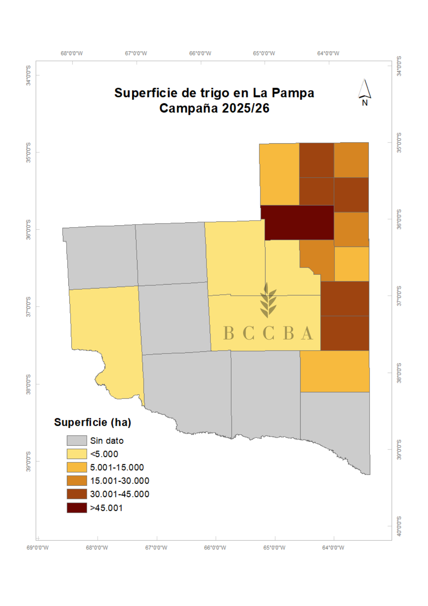 Desde el punto de vista territorial, los departamentos de Conhelo, Guatraché, Atreucó y Trenel concentran cerca del 50 % de la superficie triguera provincial. En particular, Atreucó y Guatraché se destacan con un incremento del 30 % respecto del promedio histórico. En contraste, Capital – el segundo departamento con mayor promedio histórico de superficie destinada a trigo- presentaría en esta campaña un recorte superior al 30 %.
