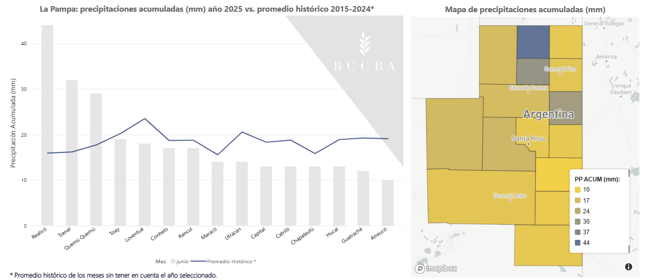 Durante junio, las precipitaciones acumuladas fueron escasas, en línea con los valores históricos. Sin embargo, departamentos como Realicó, Trenel y Quemú Quemú registraron lluvias superiores a lo habitual. Según los últimos mapas del SMN, la humedad en la capa arable es limitada, aunque el perfil sigue presentando condiciones hídricas favorables para el desarrollo inicial de los cultivos de invierno.