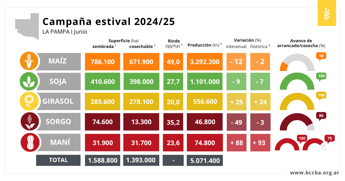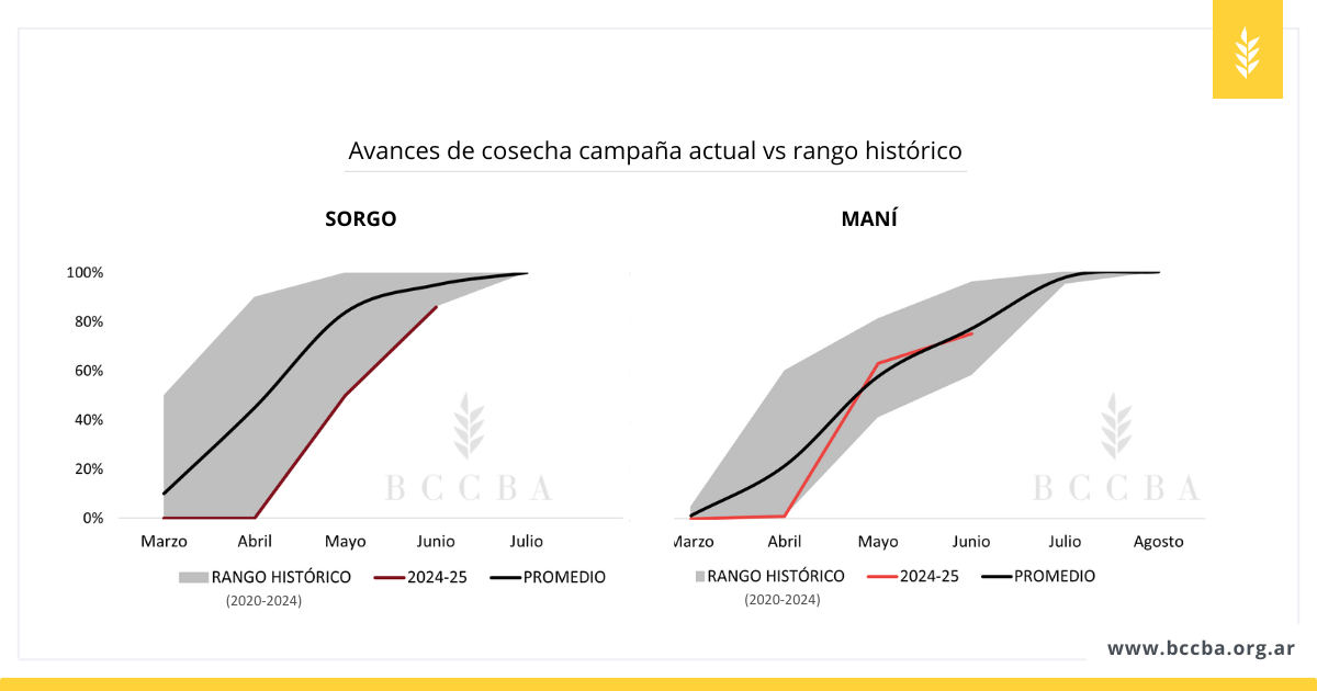 En cuanto a la evolución de la campaña, destaca el maní, que alcanzaría una producción récord debido a una expansión significativa del área sembrada, la mayor desde que se tienen registros y que duplica ampliamente el promedio histórico provincial. La cosecha se realizaba con normalidad, aunque se registraron algunas demoras puntuales debido a la humedad en sectores como Chapaleufú. Los mejores rindes se dieron en la zona de Ingeniero Luiggi, donde rondan los 32 qq/ha de grano limpio y seco.