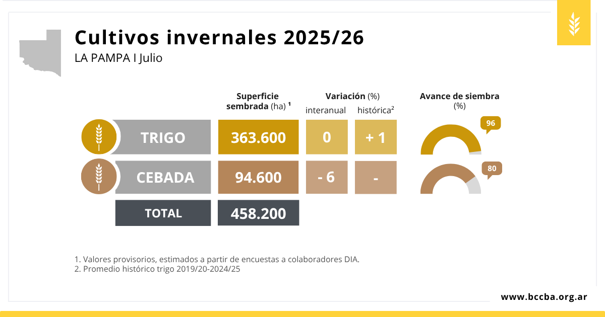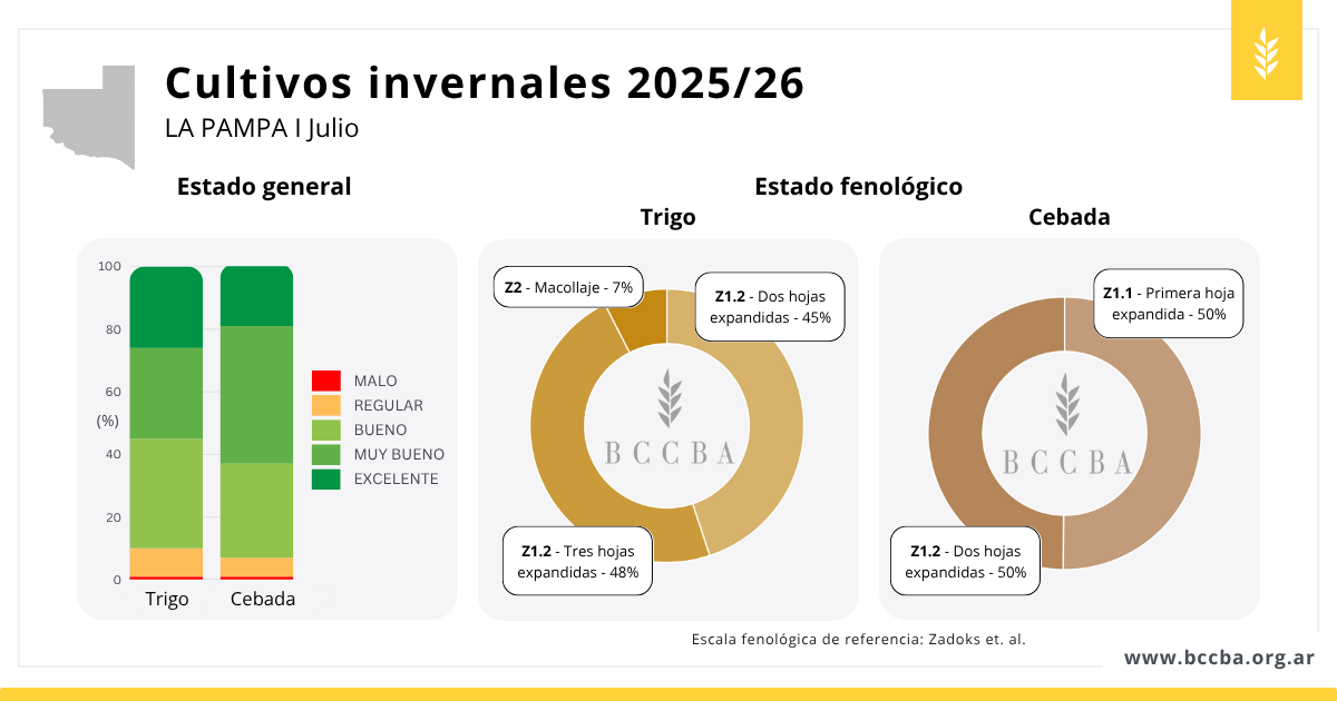 Hacia finales de julio, los cereales de invierno presentan una condición general alentadora en La Pampa, aunque aumentó la frecuencia de síntomas por heladas y estrés hídrico respecto al mes anterior. Las reservas hídricas aún sostienen el desarrollo inicial, pero la falta de precipitaciones podría condicionar su evolución futura.