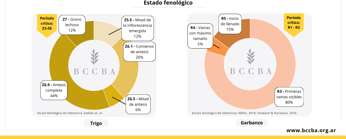 En conclusión, ambos cultivos presentan un estado sanitario general favorable, con enfermedades controladas y plagas bajo seguimiento. En trigo, la atención principal continúa sobre las chinches, peligrosas en la formación de granos, mientras que en garbanzo se deben mantener los monitoreos para prevenir nuevos focos de rabia, especialmente en lotes bajo riego o con antecedentes de alta presión de la enfermedad.