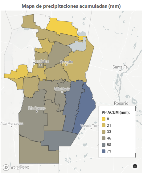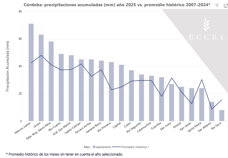 En septiembre, solo en los departamentos San Justo, Santa María y Río Seco no se alcanzaron los promedios de precipitaciones acumuladas mensuales. Por otro lado, donde más llovió fue en los departamentos Marcos Juárez y Unión, donde se reportaron algunos daños por exceso de agua en trigo.
