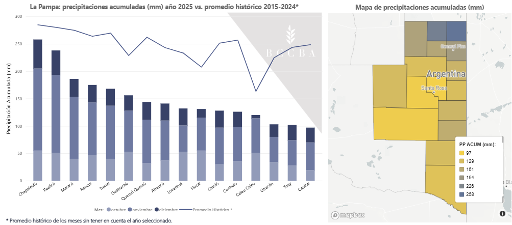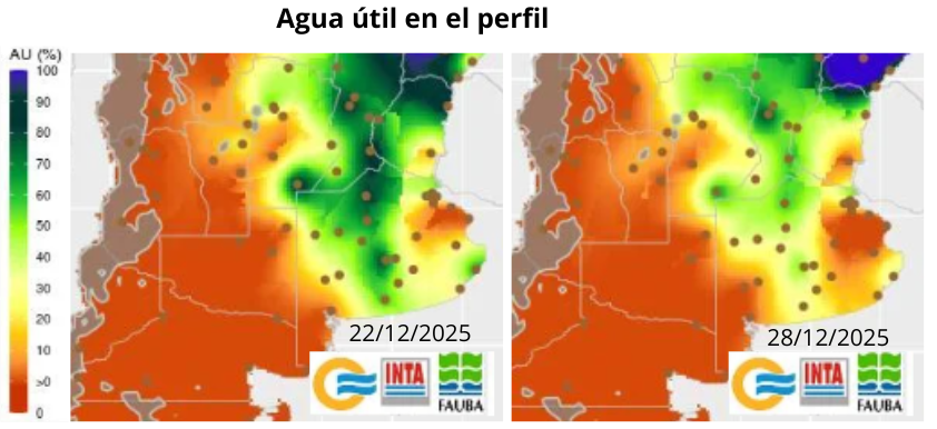 Durante los últimos tres meses, período en el que se desarrolló la siembra de cultivos estivales, las precipitaciones se ubicaron por debajo de los valores promedio, con la excepción de noviembre, cuando se registraron lluvias abundantes en los departamentos del sur que permitieron avanzar con las labores de implantación. Este déficit hídrico, combinado con temperaturas elevadas, redujo las reservas de agua en el suelo y puso de manifiesto la necesidad de nuevos aportes de humedad. Según el pronóstico trimestral del SMN, se esperan lluvias dentro de los valores normales para los primeros meses del año, mejorando las previsiones previas, mientras que las temperaturas se mantendrían por encima de lo normal, en línea con el comportamiento observado durante las últimas semanas de primavera y las primeras del verano.