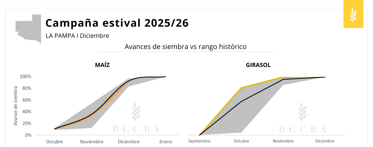 La siembra de cultivos estivales en La Pampa se encontraba prácticamente finalizada hacia fines de diciembre, en línea con los tiempos habituales para la región. Si bien las lluvias han sido escasas e irregulares, las precipitaciones registradas recientemente permitieron retomar y completar las labores pendientes. En este contexto, se prevé que la siembra de soja, maíz y sorgo concluya durante los primeros días de enero.