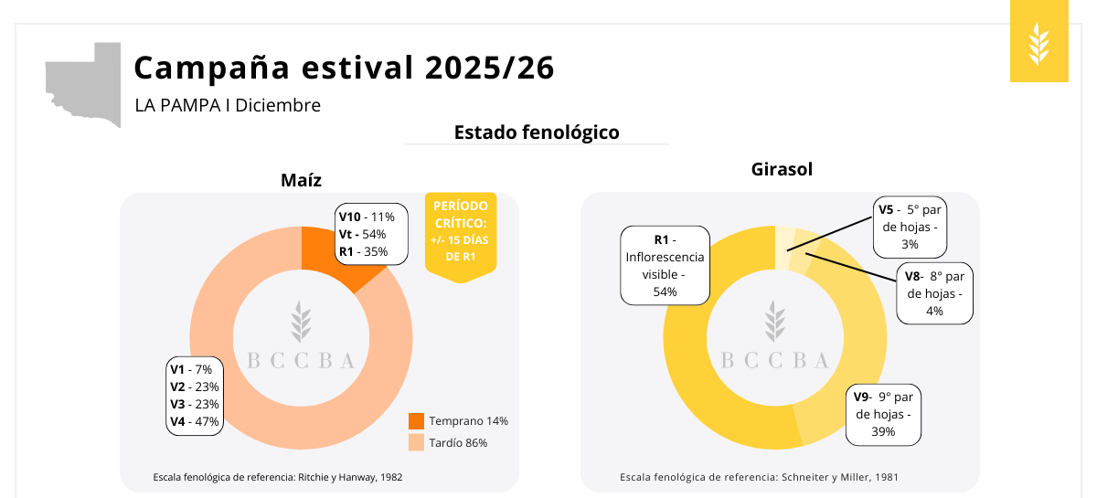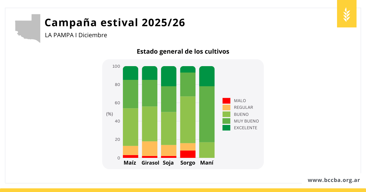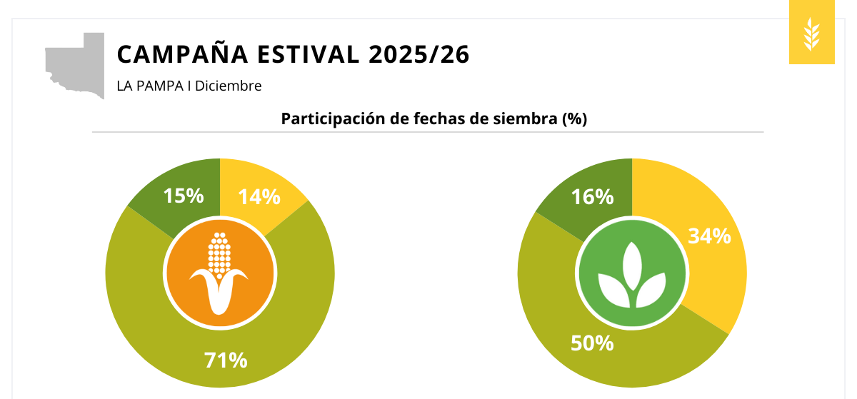 Con la siembra prácticamente concluida y una mayor proporción de maíz de primera y soja temprana respecto de la campaña anterior, los cultivos estivales en La Pampa presentan en general un estado de bueno a muy bueno. No obstante, la escasez e irregularidad de las lluvias, sumadas a las altas temperaturas, comienzan a marcar diferencias entre cultivos y fechas de siembra. A medida que varios lotes ingresan a etapas reproductivas, la disponibilidad hídrica se consolida como el principal factor de riesgo para sostener el desempeño productivo en las próximas semanas.