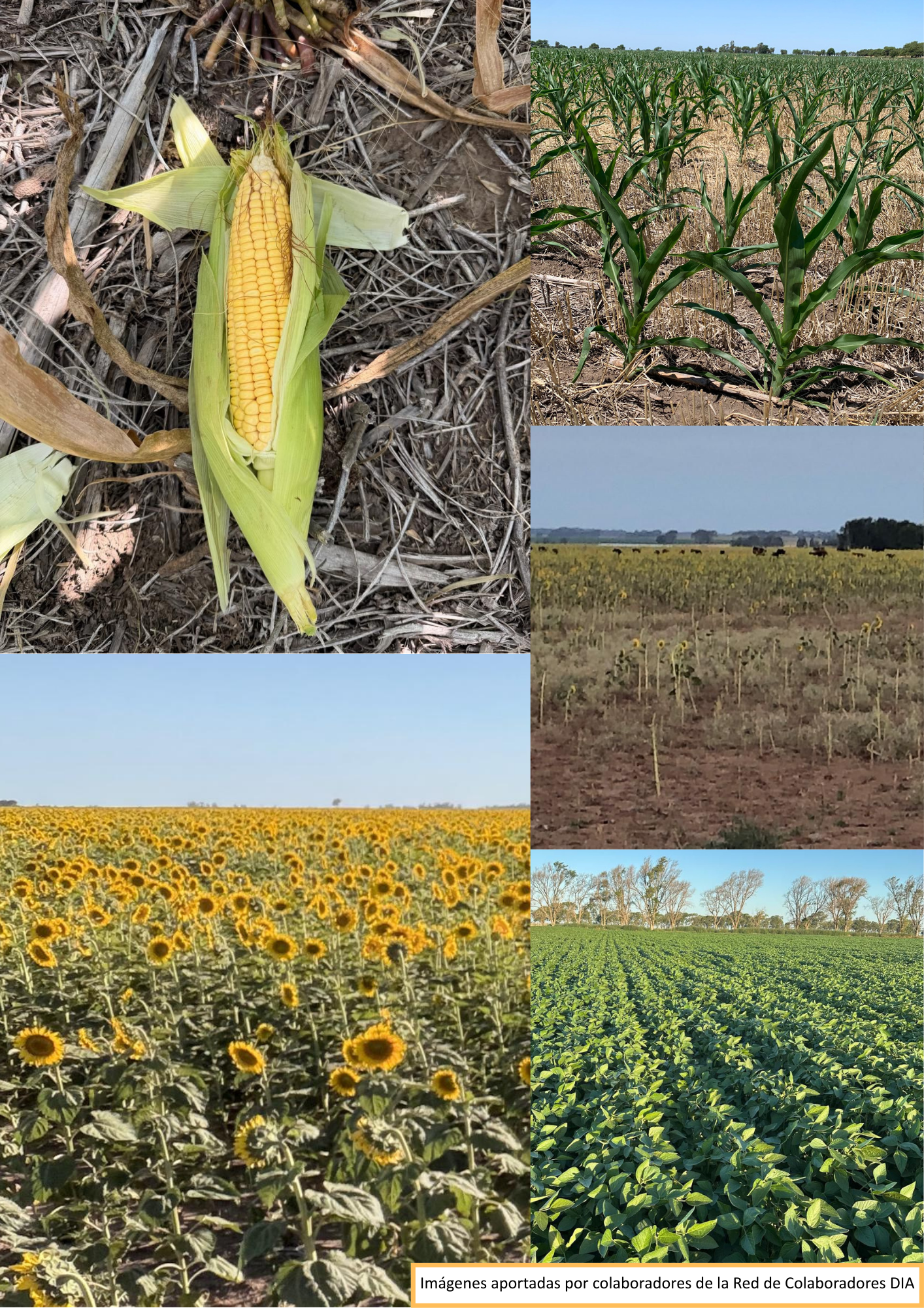 La soja temprana y el maní transitan floración y se aproximan a su período crítico, mientras que la soja tardía y el sorgo permanecen mayormente en etapa vegetativa. En soja, los colaboradores reportan una situación dispar: mayor afectación en soja de primera y una mejor respuesta relativa en parte de la soja de segunda tras lluvias recientes, aunque con alta dependencia de nuevos aportes. En maní se señalan síntomas de estrés en las horas de mayor demanda, como pliegue de folíolos, y en sorgo un deterioro más evidente del estado general, a la espera de precipitaciones que permitan su recuperación; en algunos casos, como en la zona de Quehué, se informaron tormentas con viento y granizo que provocaron desflecado foliar.