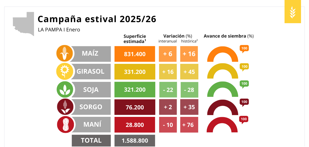 Durante la primera quincena de enero finalizó la siembra estival en La Pampa, y el ciclo se desarrolla con los cultivos establecidos y con un contraste creciente entre regiones y fechas de siembra. En general, el inicio de la campaña permitió un buen arranque, aunque con lluvias desparejas y reservas que en distintos sectores se presentaban ajustadas.
