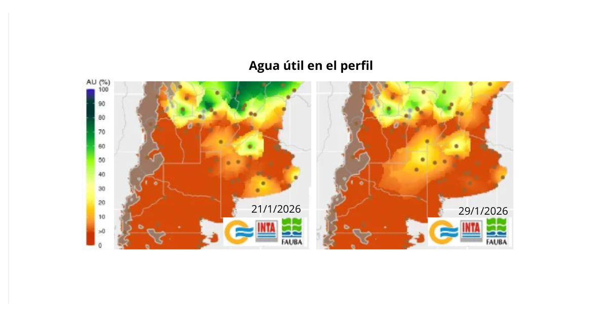 Durante la primera parte de enero predominó una escasez de lluvias que limitó la disponibilidad de agua para los cultivos. Hacia la última semana del mes se registraron precipitaciones más generalizadas, con mayores acumulados en el norte; el máximo semanal reportado fue de 70 mm en General Pico. Estas lluvias permitieron una mejora del agua útil en el perfil respecto de la semana previa y, en términos de acumulados mensuales, en la mayoría de los departamentos de la zona relevada enero se ubicó cerca o por encima del promedio histórico; donde resultó inferior, fue solo levemente. No obstante, los mapas indican que la disponibilidad hídrica continúa siendo escasa en amplios sectores, con una recomposición parcial y desigual.