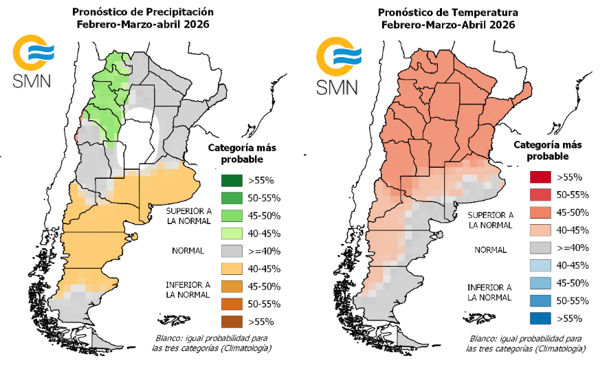 Para los meses febrero-marzo-abril, en el pronóstico trimestral del SMN hay igual probabilidad para las tres categorías de ocurrencia de precipitaciones en la provincia de Córdoba y se esperan temperaturas por encima de lo normal.