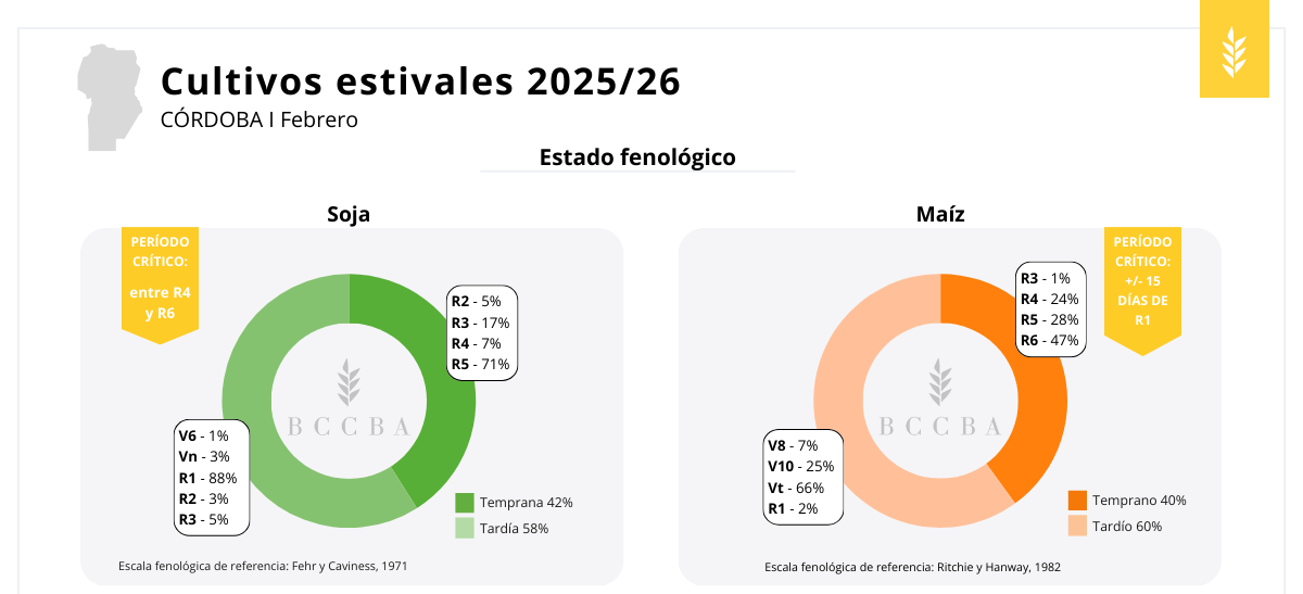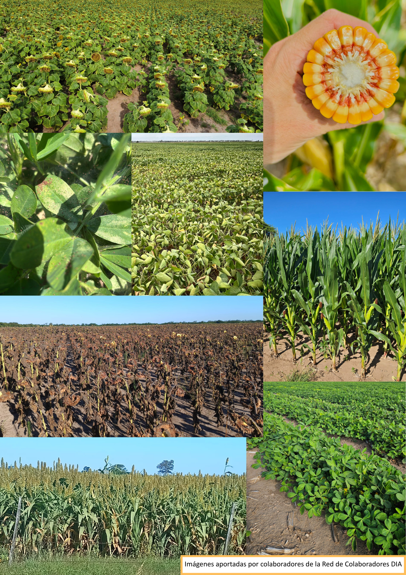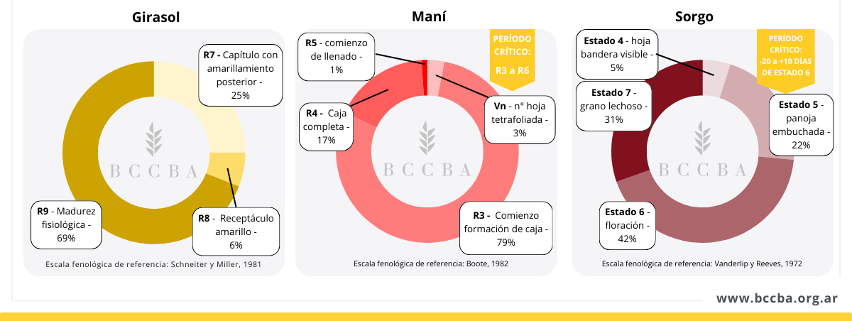 La soja temprana, el maní y sorgo se encontraban transitando el período crítico, en la mayoría de los lotes y el maíz tardío estaba entrando a esa fase. En este contexto, se manifiesta la necesidad de la continuación de las lluvias que se dieron en los primeros días de febrero para sostener los rindes de esta primera estimación. La soja tardía aún no alcanzó la fase crítica de definición de rendimientos mientras el maíz temprano y el girasol ya lo superaron. Este último estaba, en su mayoría, en madurez fisiológica.