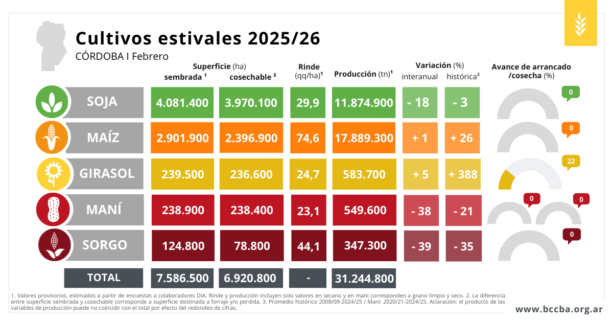 Sin haber comenzado la cosecha y con una marcada disparidad en las lluvias entre el norte y el sur provincial, la campaña estival muestra resultados contrastantes. Las principales pérdidas de potencial se concentran en el sur, afectando especialmente los rindes de maíz. En este contexto, la producción de soja, maní y sorgo caería respecto al promedio histórico, mientras que en maíz y girasol el aumento interanual de superficie permitiría sostener o incrementar levemente el volumen producido frente al ciclo previo. En este primer cálculo se proyectó una producción total de cultivos estivales de 31,2 Mt, 3 millones menos que en la campaña pasada.