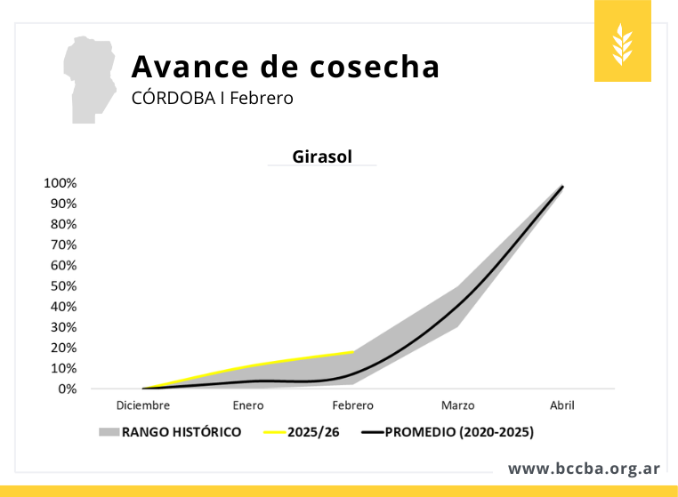 Al momento del relevamiento, la totalidad de los lotes continuaban en pie, con excepción del girasol, que registraba un avance de cosecha del 22 %, más del doble de lo habitual para la época, ya que en febrero la recolección de la oleaginosa suele encontrarse apenas iniciando. El cultivo presenta un escenario productivo heterogéneo: mientras en algunas zonas se proyectan buenos rindes, en otras la falta de humedad durante el período crítico redujo el potencial. Su cosecha anticipada y el incremento de área refuerzan su rol estratégico en la rotación, favoreciendo la recarga hídrica del perfil y la planificación de la campaña invernal.