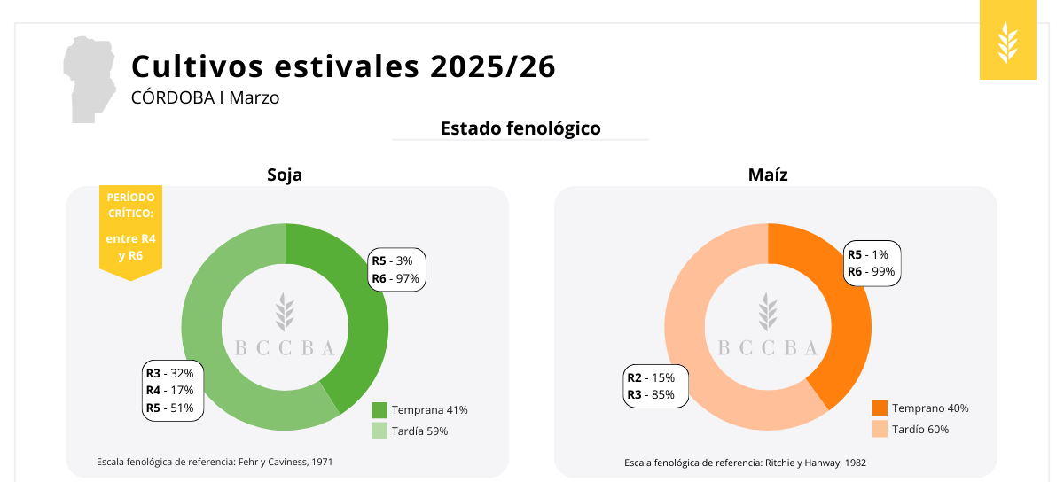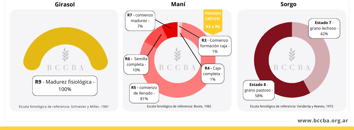 En cuanto a la fenología, la soja y el maní aún se encontraban en mayor proporción en período crítico, por lo que los rendimientos definitivos dependerán de la evolución climática en las próximas semanas. En maíz, girasol y sorgo, en cambio, ya se había superado la etapa de definición de rendimiento y la producción se ajustará progresivamente con el avance de la cosecha.